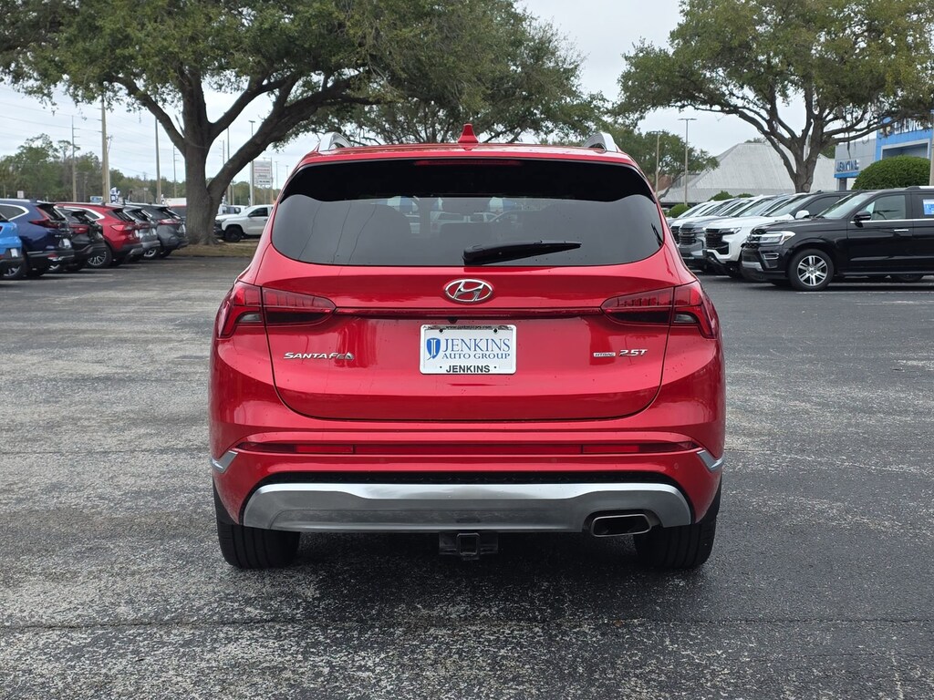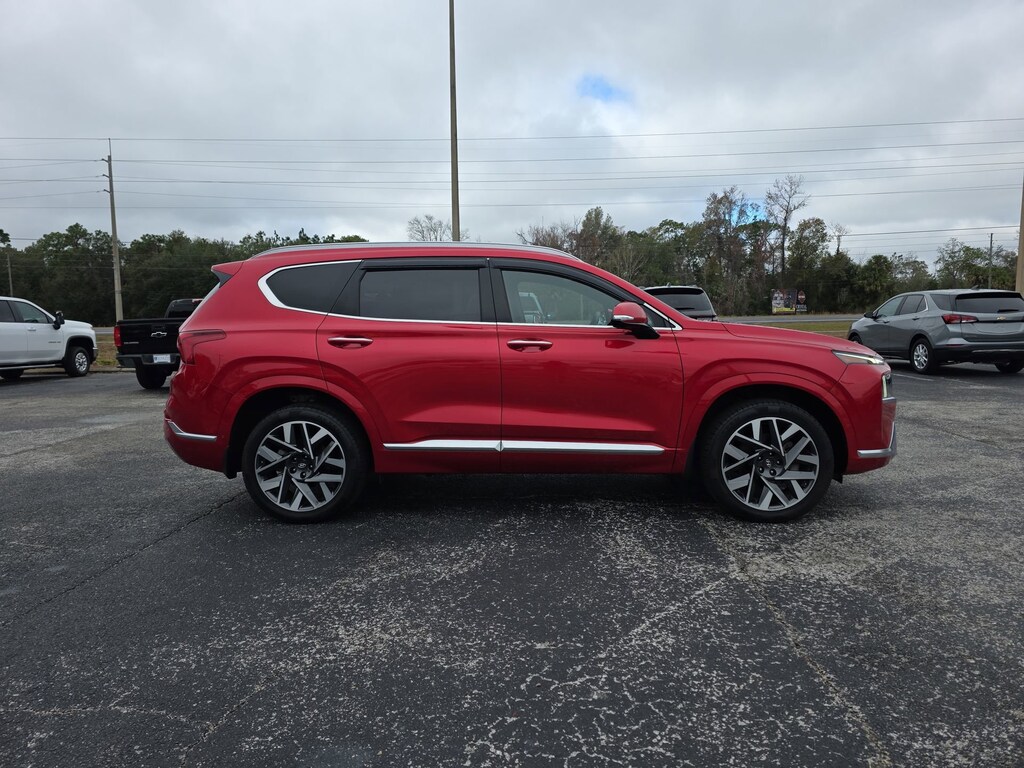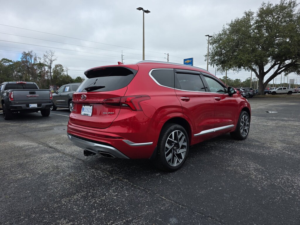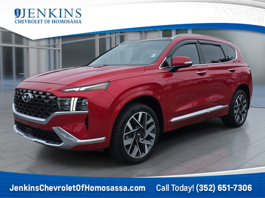 This vehicle comes equipped with Option Group 01, AWD, Black Leather, 12 Speakers, 4-Wheel Disc Brakes, ABS brakes, Air Conditioning, Alloy wheels, AM/FM radio: SiriusXM, Apple CarPlay & Android Auto, Auto High-beam Headlights, Auto-dimming Rear-View mirror, Automatic temperature control, Axle Ratio: 3.316, Brake assist, Bumpers: body-color, Cargo Cover/Screen, Cargo Net, Cargo Tray, Delay-off headlights, Driver door bin, Driver vanity mirror, Dual front impact airbags, Dual front side impact airbags, Electronic Stability Control, Emergency communication system, Exterior Parking Camera Rear, Four wheel independent suspension, Front anti-roll bar, Front Bucket Seats, Front Center Armrest, Front dual zone A/C, Front reading lights, Fully automatic headlights, Garage door transmitter: HomeLink, harman/kardon® Speakers, Heads-Up Display, Heated & Ventilated Front Bucket Seats, Heated door mirrors, Heated front seats, Heated rear seats, Heated steering wheel, Illuminated entry, Leather steering wheel, Low tire pressure warning, Memory seat, Mudguards, Navigation System, Occupant sensing airbag, Outside temperature display, Overhead airbag, Overhead console, Panic alarm, Passenger door bin, Passenger vanity mirror, Power door mirrors, Power driver seat, Power Liftgate, Power moonroof, Power passenger seat, Power steering, Power windows, Quilted Premium Nappa Leather Seat Trim, Radio: AM/FM Harman Kardon Display Audio, Rain sensing wipers, Rear anti-roll bar, Rear seat center armrest, Rear window defroster, Rear window wiper, Remote keyless entry, Security system, Speed control, Speed-sensing steering, Split folding rear seat, Spoiler, Steering wheel mounted audio controls, Tachometer, Telescoping steering wheel, Tilt steering wheel, Traction control, Trip computer, Turn signal indicator mirrors, Variably intermittent wipers, Ventilated front seats, and Wheels: 20" x 8.0J Alloy . Jenkins Chevrolet of Homosassa proudly serving Homosassa, Spring Hill, Hernando, Crystal River, Beverly Hills, Inverness. Just a half hour North of Buccaneer Bay. Come see the large, expansive inventory of the Jenkins Auto Group. 21/28 City/Highway MPG AWD, Black Leather. Clean CARFAX. CARFAX One-Owner. Calypso Red 2023 Hyundai Santa Fe Calligraphy AWD Shiftronic 2.5L I4
