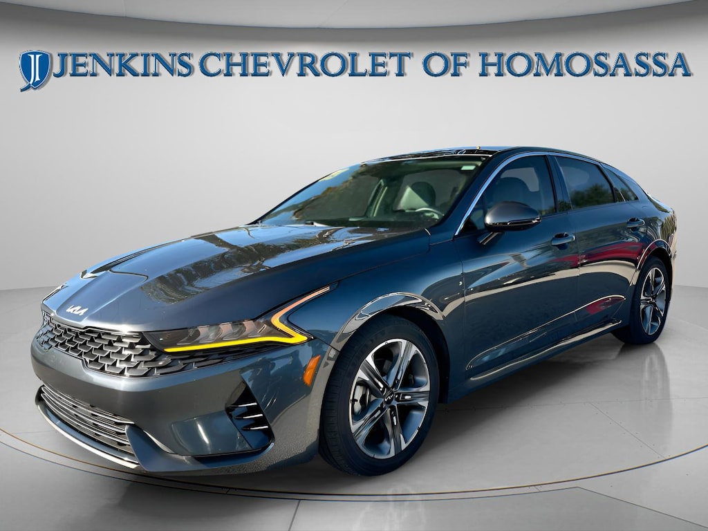 This vehicle comes equipped with EX Ash Blue Color Package, 4-Wheel Disc Brakes, 6 Speakers, ABS brakes, Air Conditioning, Alloy wheels, AM/FM radio: SiriusXM, Apple CarPlay & Android Auto, Auto High-beam Headlights, Automatic temperature control, Brake assist, Bumpers: body-color, Carpeted Floor Mats, Delay-off headlights, Driver door bin, Driver vanity mirror, Dual front impact airbags, Dual front side impact airbags, Electronic Stability Control, Emergency communication system, Four wheel independent suspension, Front anti-roll bar, Front Bucket Seats, Front Center Armrest, Front dual zone A/C, Front reading lights, Fully automatic headlights, Heated & Ventilated Front Bucket Seats, Heated door mirrors, Heated front seats, Illuminated entry, Knee airbag, Low tire pressure warning, Navigation System, Occupant sensing airbag, Outside temperature display, Overhead airbag, Overhead console, Panic alarm, Passenger door bin, Passenger vanity mirror, Power door mirrors, Power driver seat, Power moonroof, Power steering, Power windows, Radio data system, Radio: AM/FM/MP3 Audio System, Rear anti-roll bar, Rear reading lights, Rear seat center armrest, Rear side impact airbag, Rear window defroster, Remote keyless entry, Security system, Smart Key w/ Push Button and Remote Start, Speed control, Speed-sensing steering, Split folding rear seat, Steering wheel mounted audio controls, SynTex Seat Trim, Tachometer, Telescoping steering wheel, Tilt steering wheel, Traction control, Trip computer, Variably intermittent wipers, Ventilated front seats, and Wheels: 18" Gray Machined Finish Alloy . Jenkins Chevrolet of Homosassa proudly serving Homosassa, Spring Hill, Hernando, Crystal River, Beverly Hills, Inverness. Just a half hour North of Buccaneer Bay. Come see the large, expansive inventory of the Jenkins Auto Group. 27/37 City/Highway MPG CARFAX One-Owner. Gravity Gray 2023 Kia K5 EX FWD 8-Speed Automatic 1.6L I4 DGI Turbocharged DOHC 16V LEV3-ULEV70 180hp